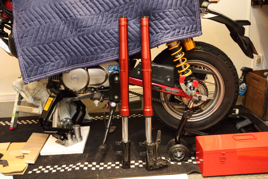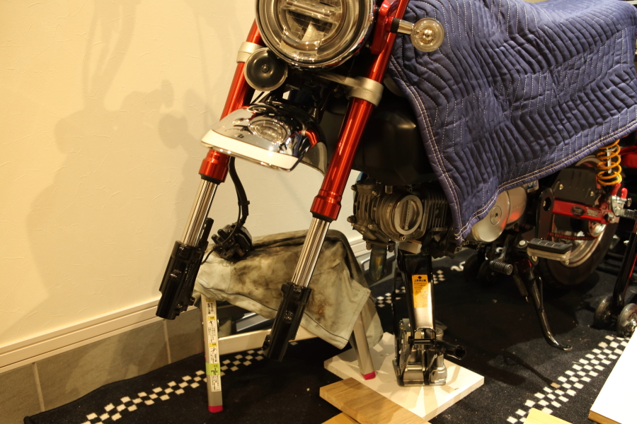 アクスルシャフト、キャリパー、フォークボトム、フロントフォークの下側固定ボルトをあらかじめ緩めておきます。