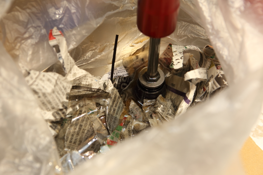 グリップは再利用ですので、パーツクリーナーをハンドルとグリップの間に吹いて、マイナスドライバーでクリクリ。