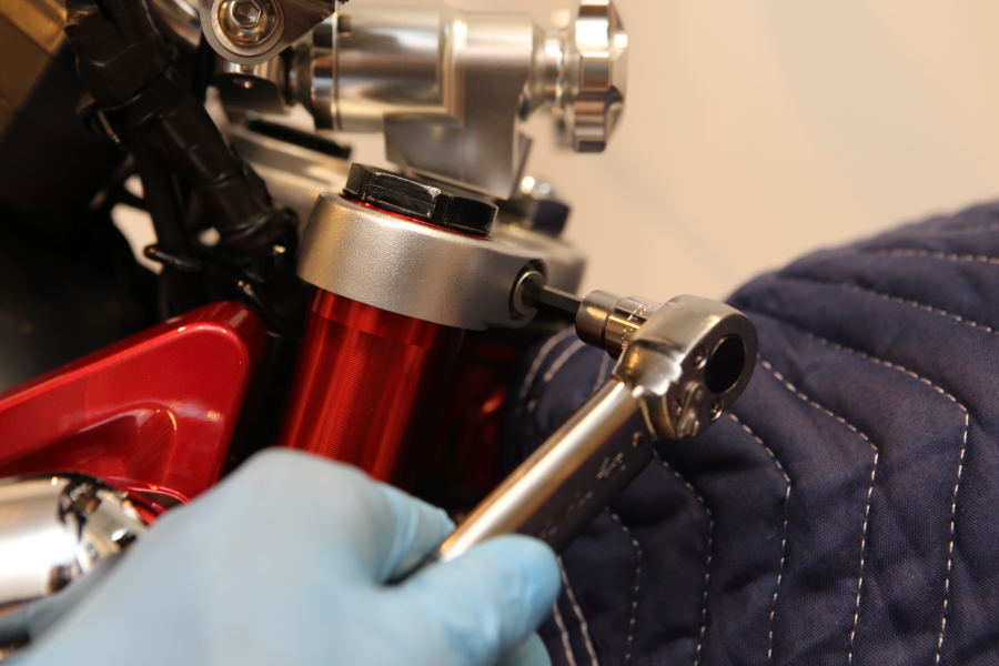 トップブリッジの固定ボルトを緩めて、フロントフォークを車体から外します。
