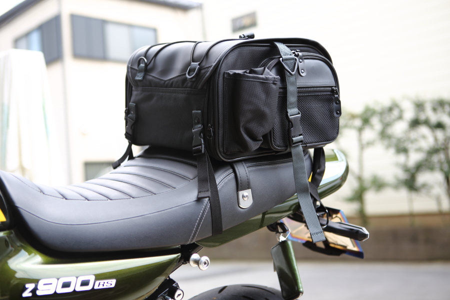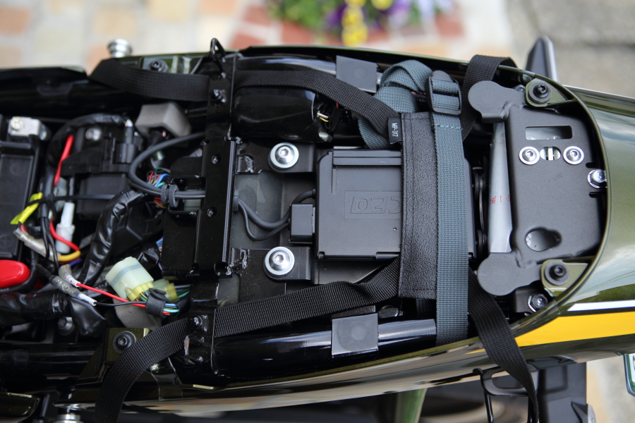 付属の固定ベルトを本来ならシートに取り付けますが、Z900RSの場合はちょっと動いちゃう感じでしたのでシート下のフレームにまわして固定しました。