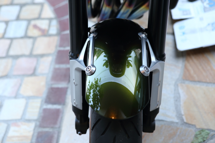 さて交換作業ですが、フェンダー部分のボルト2本、フロントフォークの部分のボルト3本で外せます。